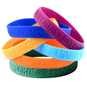 Silicone wristbands with debossed text and logos. Creates a subtle, professional appearance.